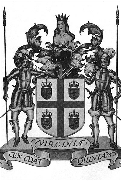 Nice logo (“coat of arms”) Virginia Company. Tobacco leaves(?) and hooters?! There was sex in marketing even then. Well, I guess it was truth in marketing if you could trade your crop for a wife.