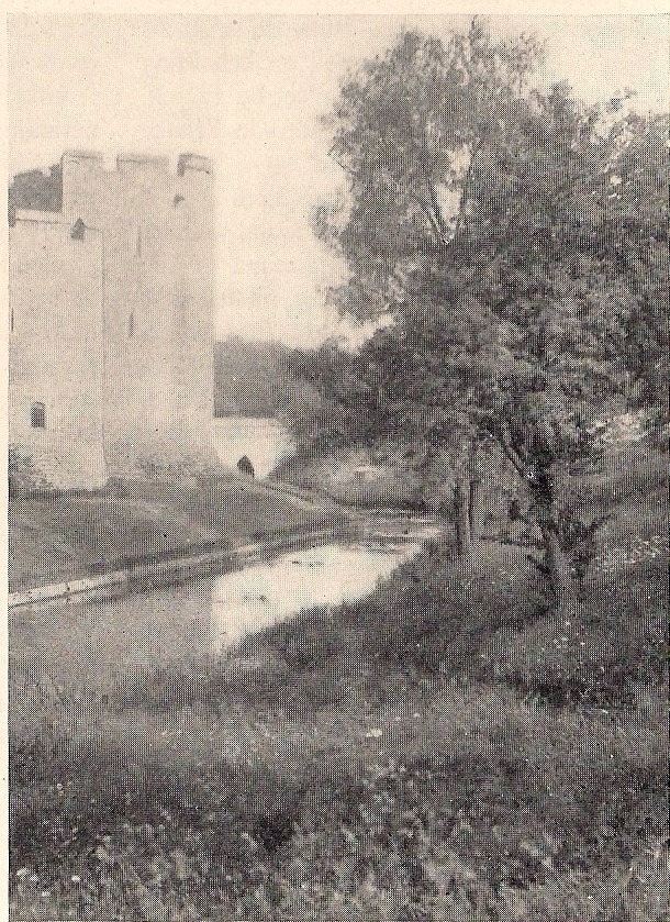 Between the eastern side of the castle and the twelfth-century wall, which bounds the moat, is about an acre of enclosed lawn, approached by a thirteenth-century door at the back of the banqueting hall.