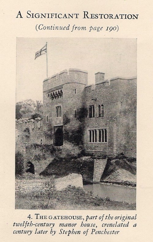 The experience gained on this straightforward piece of restoration is now being utilized to rebuild the twelfth-century banqueting hall, a work of considerable difficulty. But excavation of the two sides, of which nothing remained above ground, has revealed the bottom of a fireplace with its stone fender, the base and mouldings of the chief door, and the tiles of the pavement. The remaining two sides are intact, so that the restoration which is proceeding now will be correct in every detail.