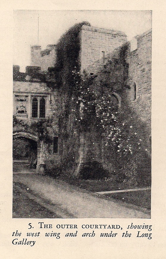 The buildings had hitherto enclosed one large courtyard; but Wyatt, in the manner of his time, built a Long Gallery across it from the Penchester porch (Figure 5), dividing it into two almost equal-sized courtyards. Wyatt’s arch leading to the inner courtyard is also seen in Figure 5. He introduced larger windows throughout the building, as in the room over the entrance arch (Figure 4), and his son decorated it so sumptuously that it was famed as a splendid house in his day.